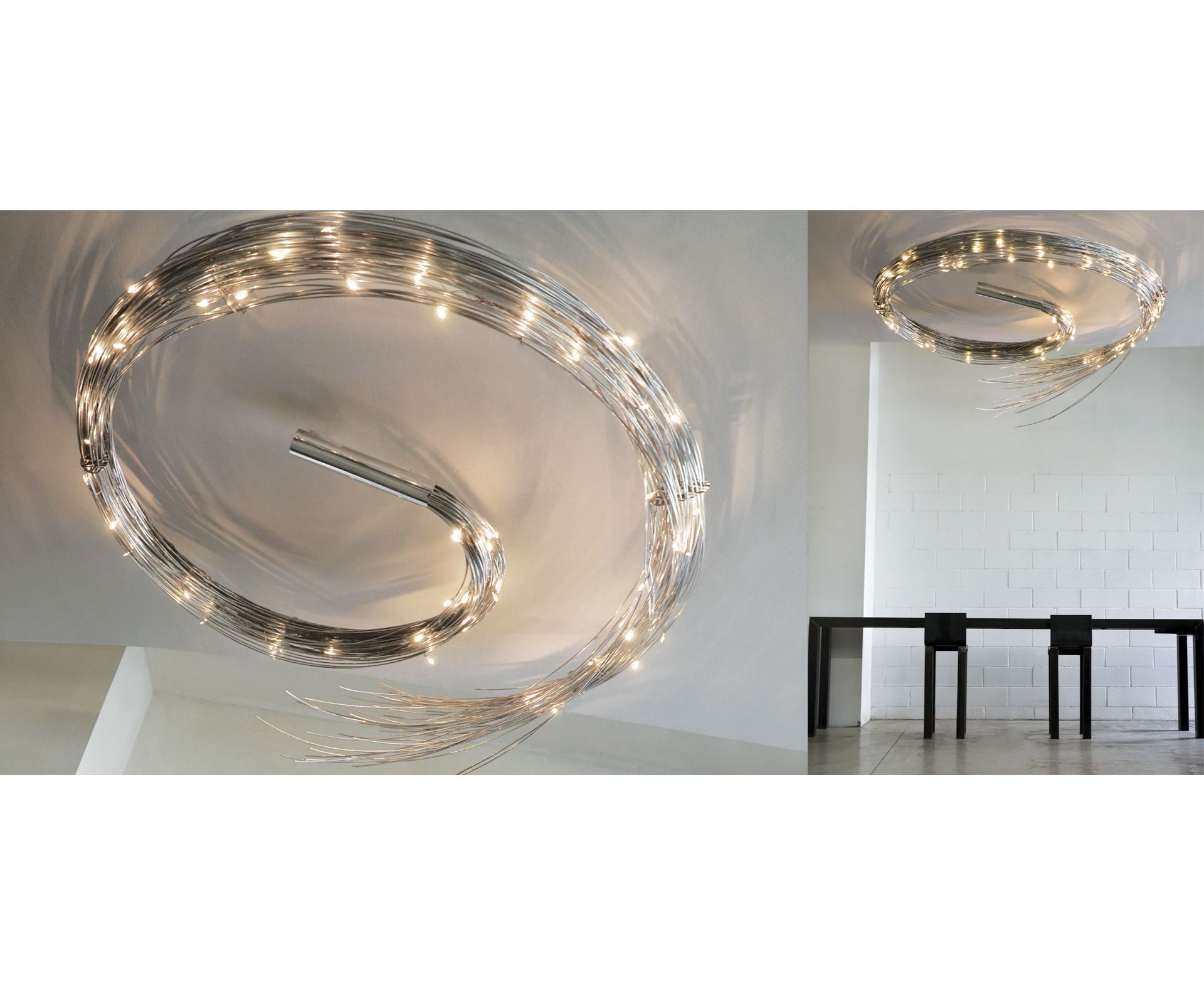 Confusione вновь появляется в бесконечном вихре, где материал имеет начало, но конец не может быть найден, «путаясь» с фоном, где он находится, и адаптируясь к нему. Коллекция ламп, которая имитирует вихрь света. Также для «Senzafine» комбинации варьируются, от настенной / потолочной до подвесной версий, с различными размерами для дизайна интерьера и требований к размещению. Базовая отделка выполнена в цвете «натуральный алюминий», но по запросу она также доступна в полностью белой версии.