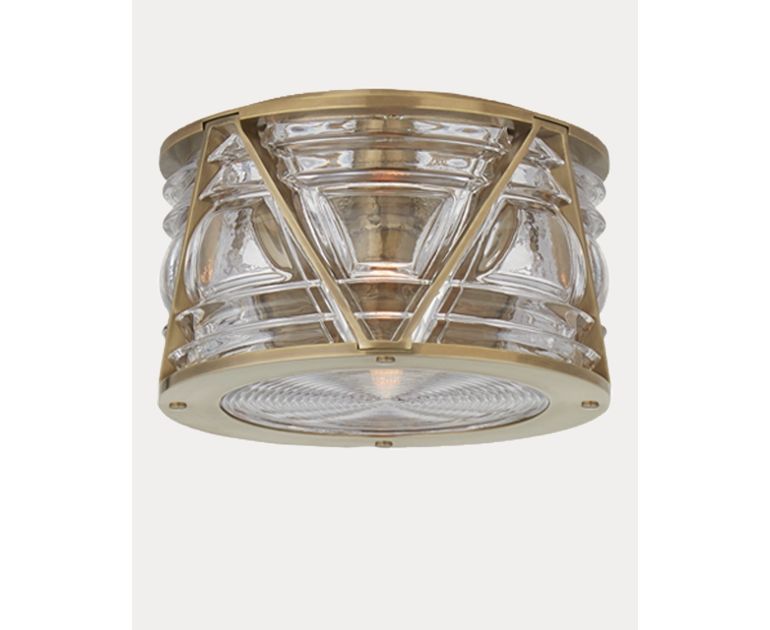 Изготовленный с клетчатой рамой, Chatham Small Flush Mount вдохновлен линзой Френеля - знакомой особенностью маяка, определяемой концентрическими кольцами стеклянных призм. Здесь эта деталь находится в тени, добавляя морскую привлекательность современному дизайну.
