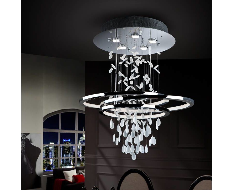 Потолочный светильник из металла с покрытием "хром". Подвески из белого стекла с прозрачной кромкой, асимметричные овалы с рассеивателями из белого метакрилата с внутренним освещением LED