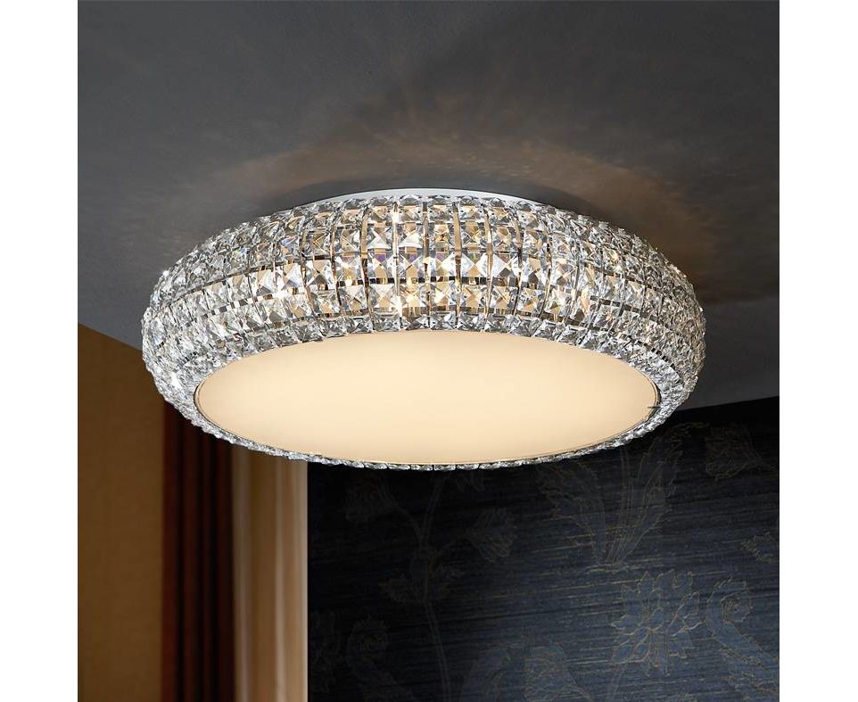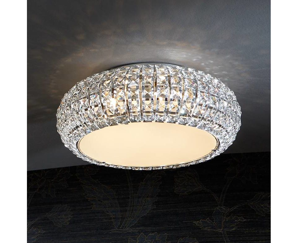Потолочный светильник маленький из металла с покрытием "хром", плафон из квадратных кристаллов из прозрачного стекла, нижний рассеиватель из стекла опалового цвета.