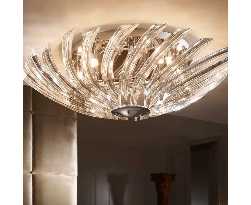 Потолочный светильник из металла с покрытием "блестящий хром", плафон в виде расходящихся лучей из изогнутых кристаллов из прозрачного высококачественного стекла
