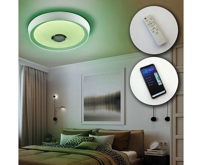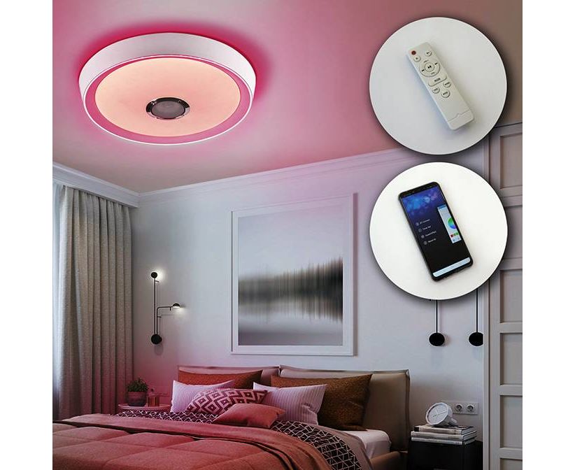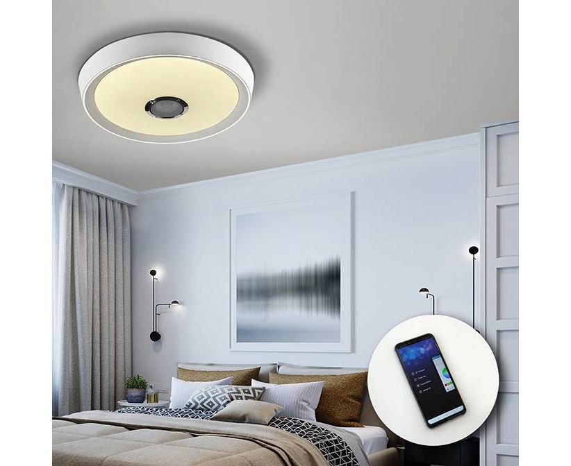 Потолочный светильник LED с колонкой из белого металла с хромированными элементами, с опаловым акриловым рассеивателем. Регулируемые яркость света и цветовая температура RGB. В комплекте с пультом дистанционного управления.