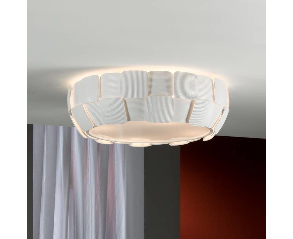 Потолочный светильник с плафоном, образованным пластинами из поликарбоната с рифлёной поверхностью. Каркас из металла с серовато-белым матовым покрытием. Нижний рассеиватель.