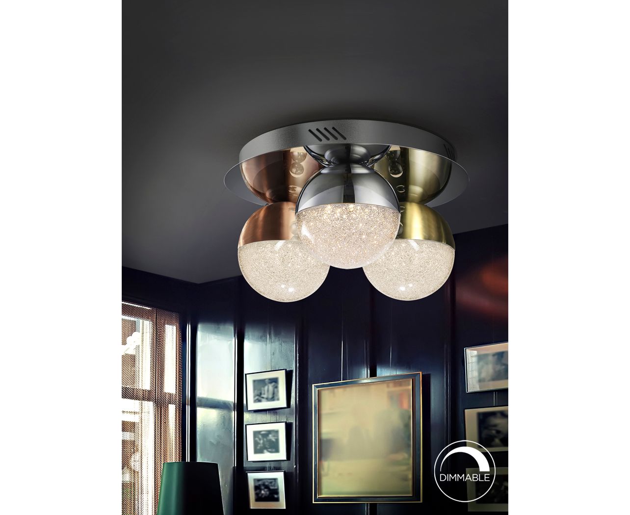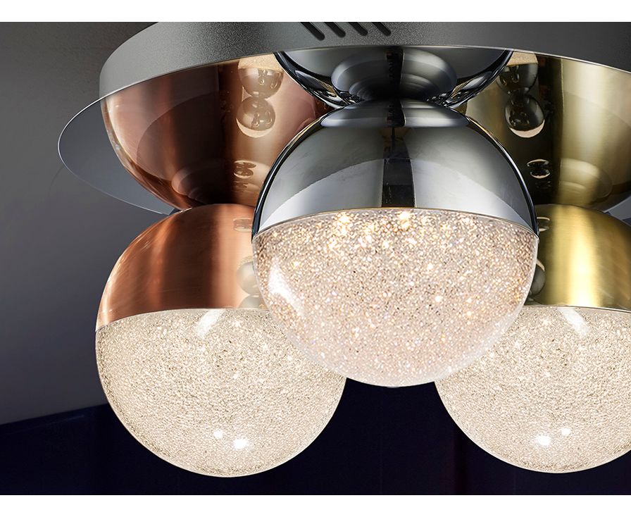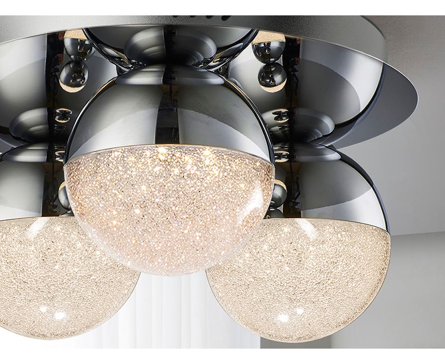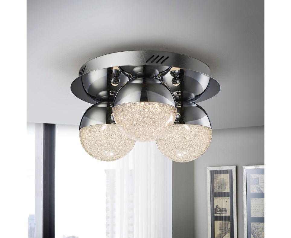 Потолочный светильник LED из металла с 3 лампами, покрытие "хром". Плафоны сферические 12Ø см из поликарбоната с фактурной внутренней поверхностью и металла с покрытием "хром", 14,4W LED, 1000 Lm, 3000 K, диммируемый.