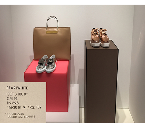 С другой стороны, поверхность яблока поглощает часть этого светового спектра, отражая другие компоненты света. Это видят наши глаза, сенсорные клетки измеряют синий, зеленый и красный компоненты света и передают их в визуальный центр мозга: в итоге создается субъективное цветовое впечатление. Поскольку не весь спектр, а только три селективные цветовые полосы измеряются и обрабатываются мозгом, возникает феномен метамерии: свет с другой композицией может производить такое же цветовое впечатление для зрителя, которое выглядят одинаково при определенном освещении, но они могут существенно различаться при различном освещении. Для освещения изделия это означает: если на искусственный свет можно влиять технически, восприятие определенных цветовых оттенков, типичных для изделий, может быть изменено в удивительно широком диапазоне.