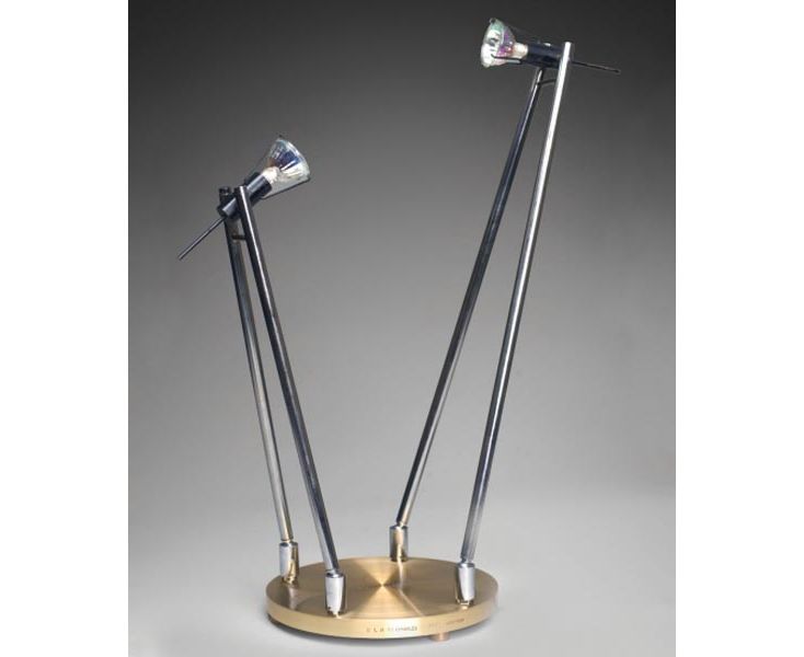 Целая конструкция создана для поддержки двух ламп, зато они могут менять направление освещения и свои позиции. Отделка - золото и никель, темный никель.