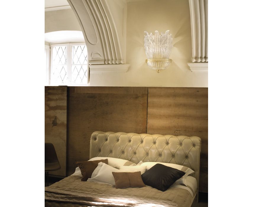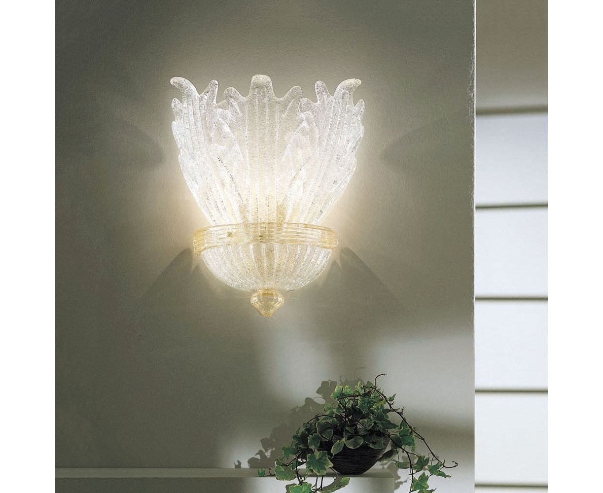 Сдержанная элегантность характеризует эту коллекцию потолочных и настенных ламп, выполненных из листьев литого стекла и деталей из янтарного стекла с золотыми чешуйками 24k.
