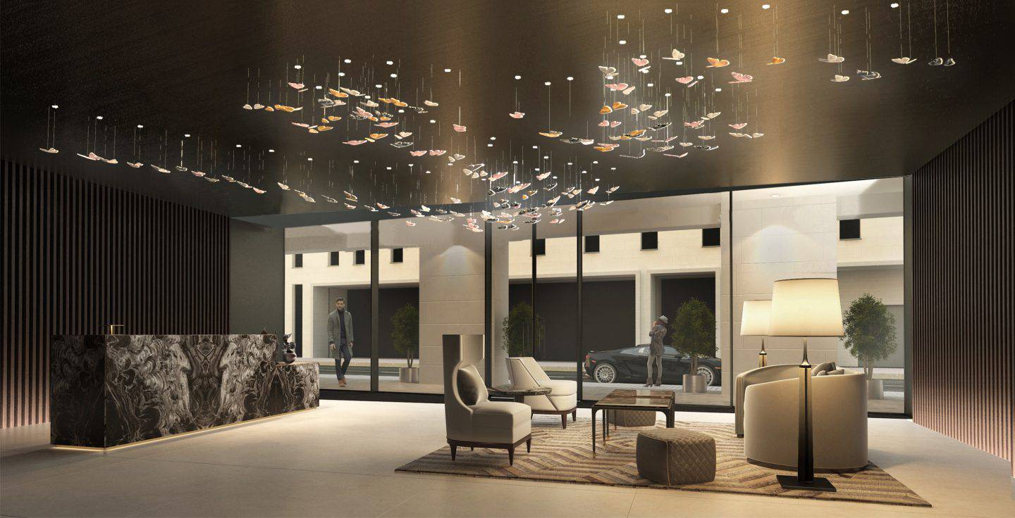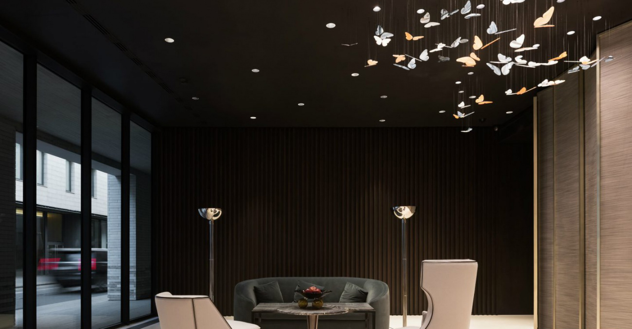 Холодные промышленные каменные фасады украшают десятки бабочек, пролетая более восьми метров - от входа до лифта. Войдите и следуйте за этой стеклянной фантазией ...
