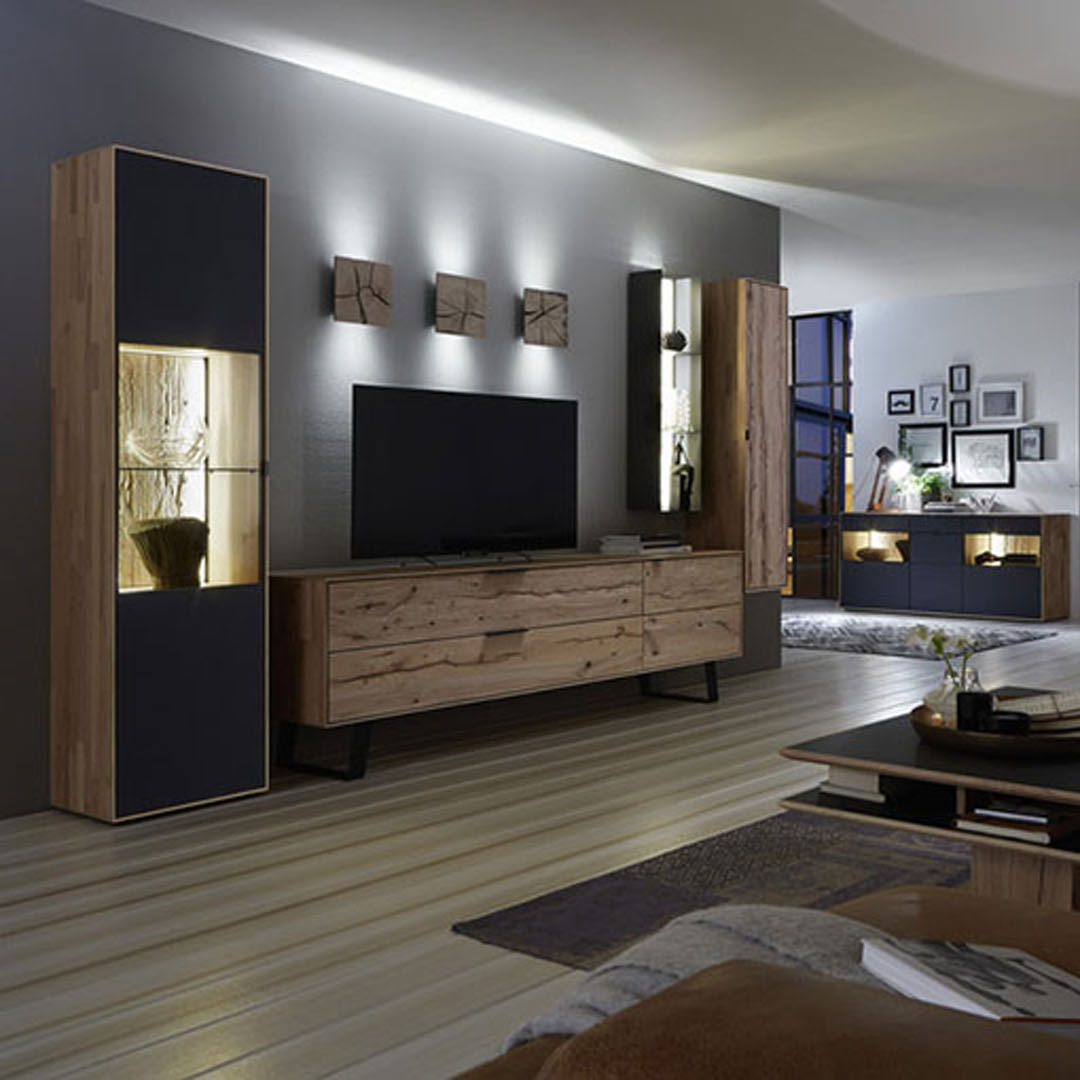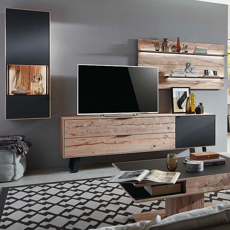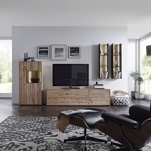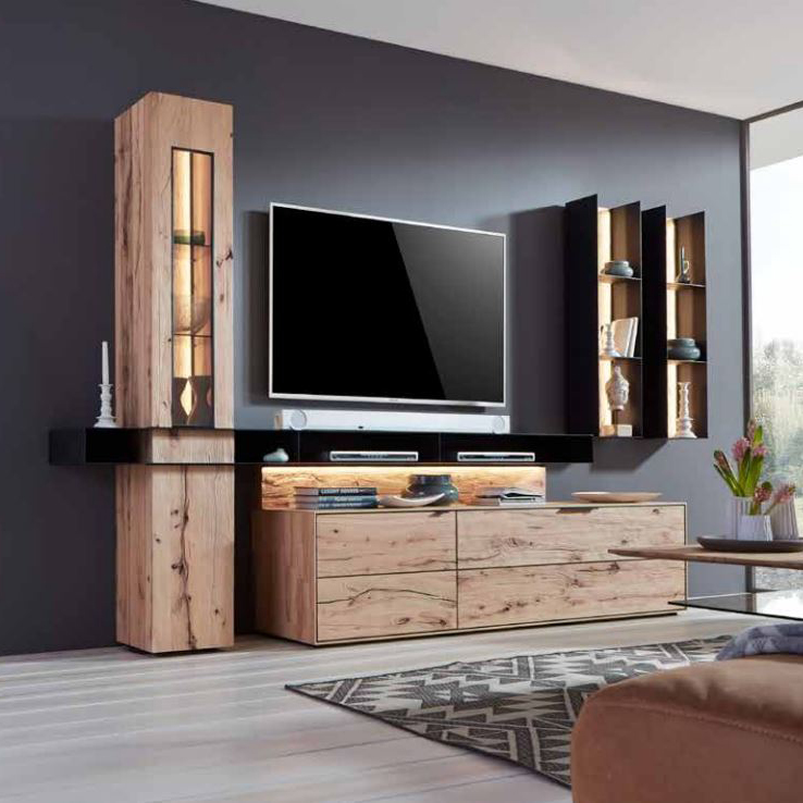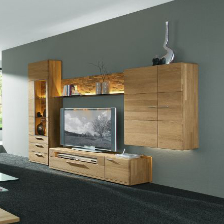 Мебельный гарнитур выполнен в классическом стиле без излишеств. Мебель изготовлена из массива древесины. В гарнитур входит стенка с несколькими шкафами, стеновые панели и письменный стол. Шкафы имеют закрытые полки в верхней части за стеклянными дверцами, внизу за деревянными. Все предметы, входящие в состав гарнитура украшены одинаковыми элементами.