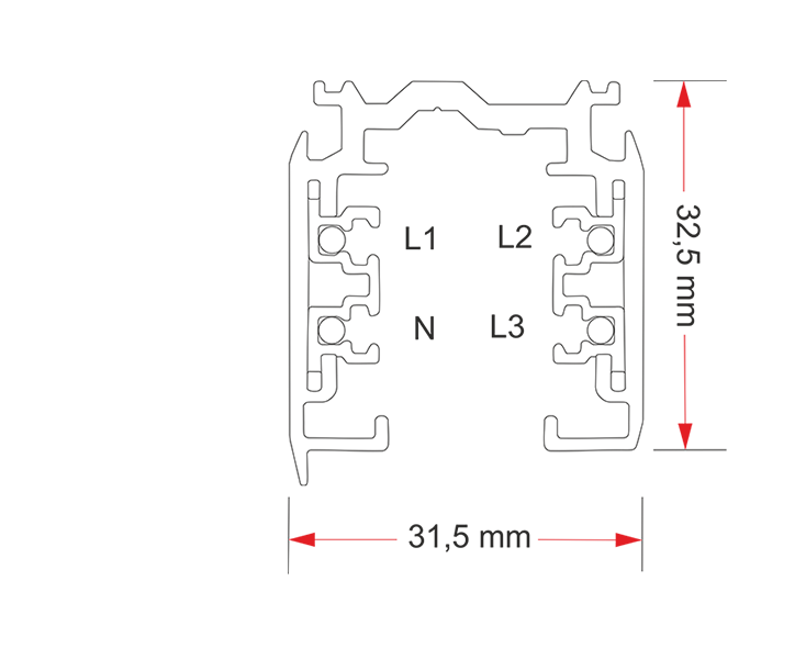 Шинопровод выполнен из алюминиевого сплава, неокрашенного, либо покрытого слоем краски с наружной стороны. Внутри за пластмассовой изоляцией расположены 4 медные жилы, 3 из которых - фазы (L1, L2, L3) и одна нейтральная (N).