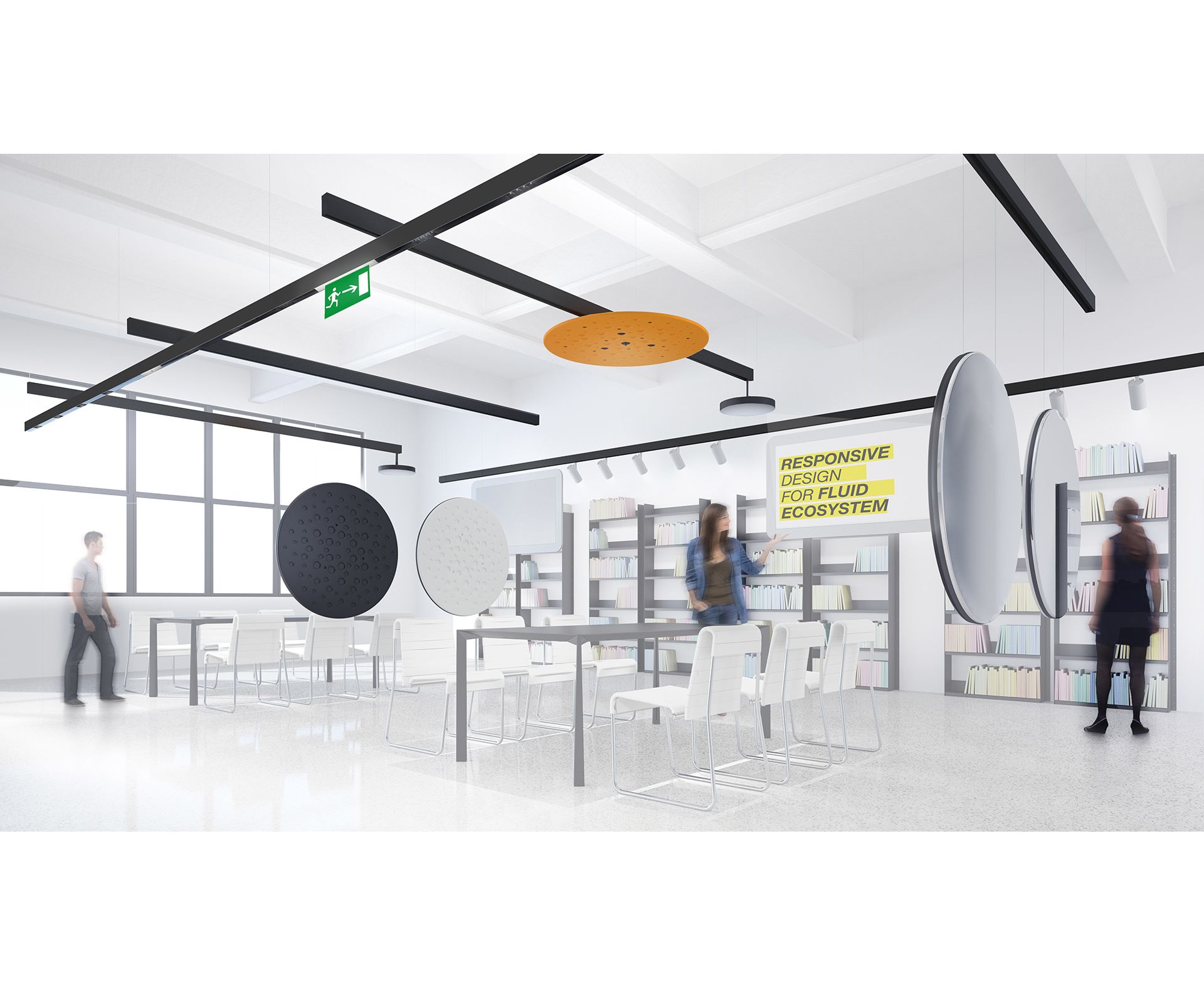 Silent Field объединяется с Mappa Mundi для создания акустических и световых островков. Звукоизоляционная панель может быть установлена как горизонтально, так и вертикально, и даже может использоваться для разделения пространства. При вертикальном использовании можно активировать двойную звукопоглощающую поверхность или добавить зеркальную сторону, чтобы относиться к окружающей ее среде. Акустические острова также могут быть укомплектованы датчиками движения и модулем контроля качества воздуха.