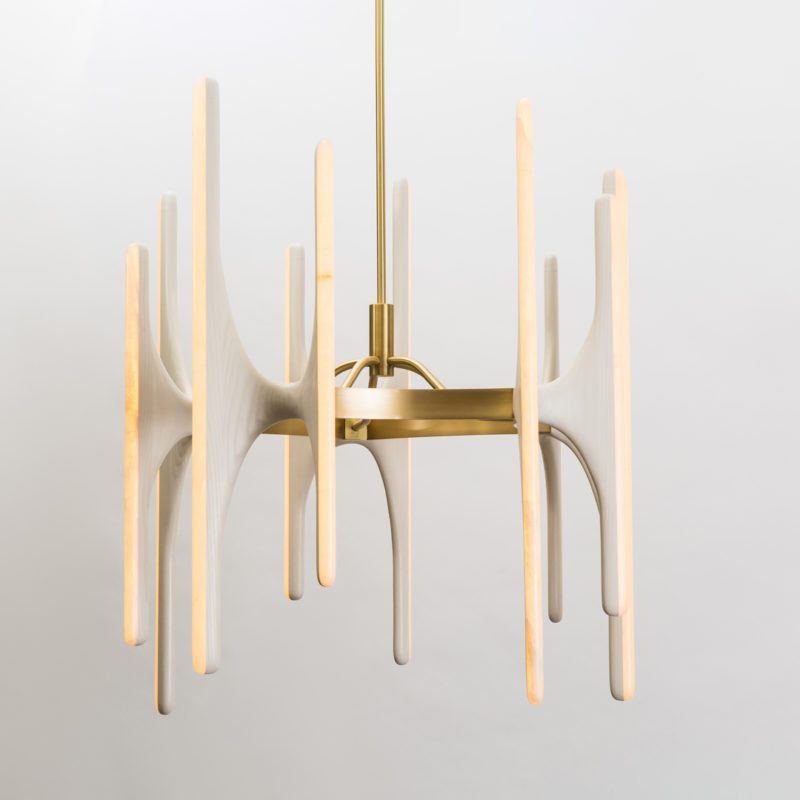 Вдохновленные природой и человеческими формами, бра и люстры серии Sculptural сделаны из бронзы или дерева асимметричной формы бабочки. Каждая вырезанная вручную форма покрыта белым ониксом, заключая в себя регулируемые светодиодные фонари, предлагая теплое, вечное свечение, поскольку светодиоды мягко излучают свет через камень.
