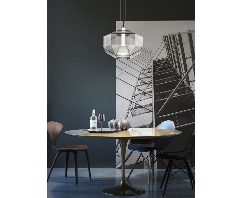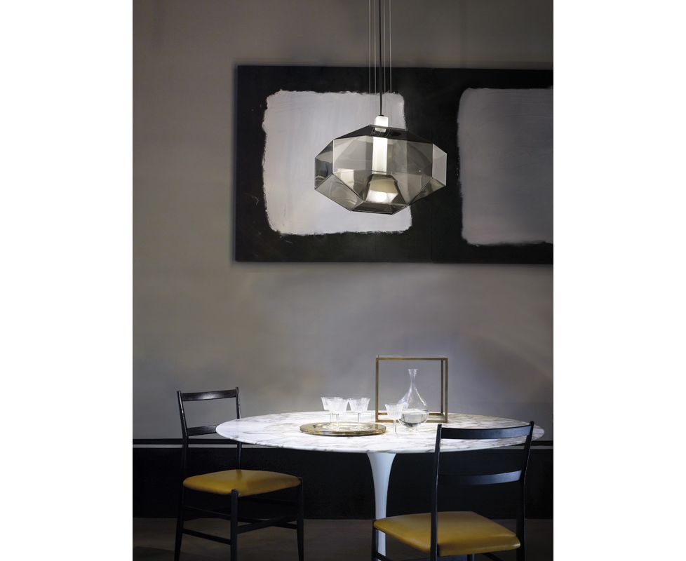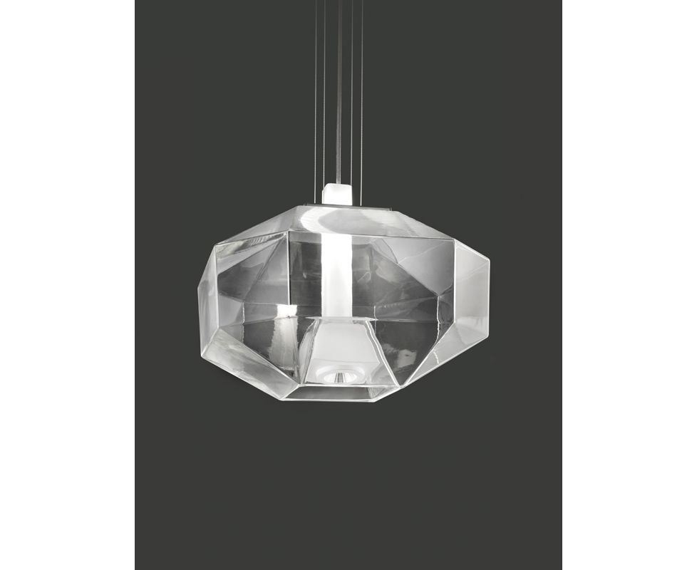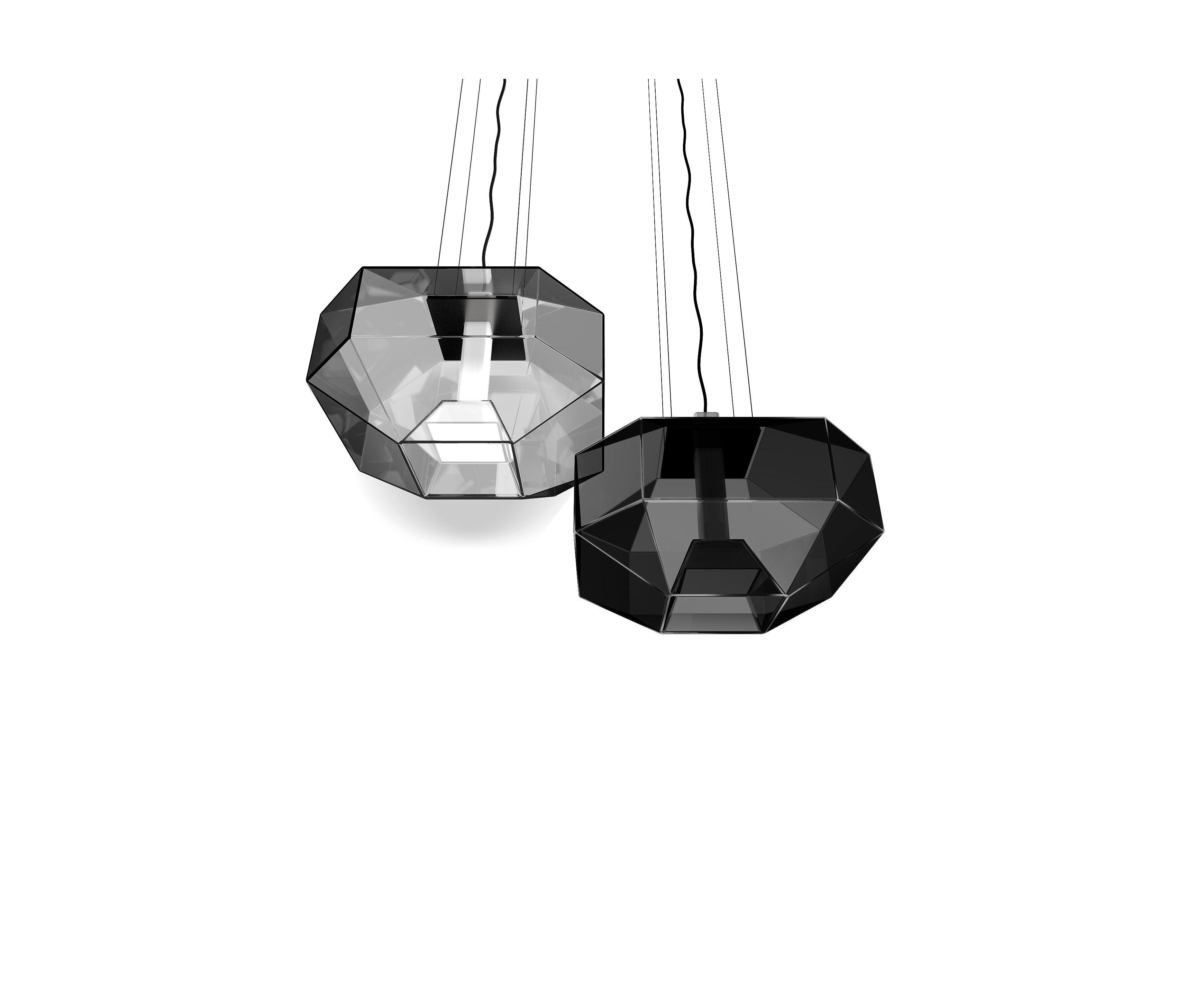 Stone - это подвесной светильник, созданный творческой группой Hangar Design Group и характеризующийся квази-скульптурными объемами, где легкость выдувного стекла противопоставляется твердости линейных геометрий. В этом контрапункте - между использованием материала, естественно склонного к круглым формам, и строгой конструкцией, требующей ребер и ортогональных линий, выражается баланс яркой, оригинальной композиции.