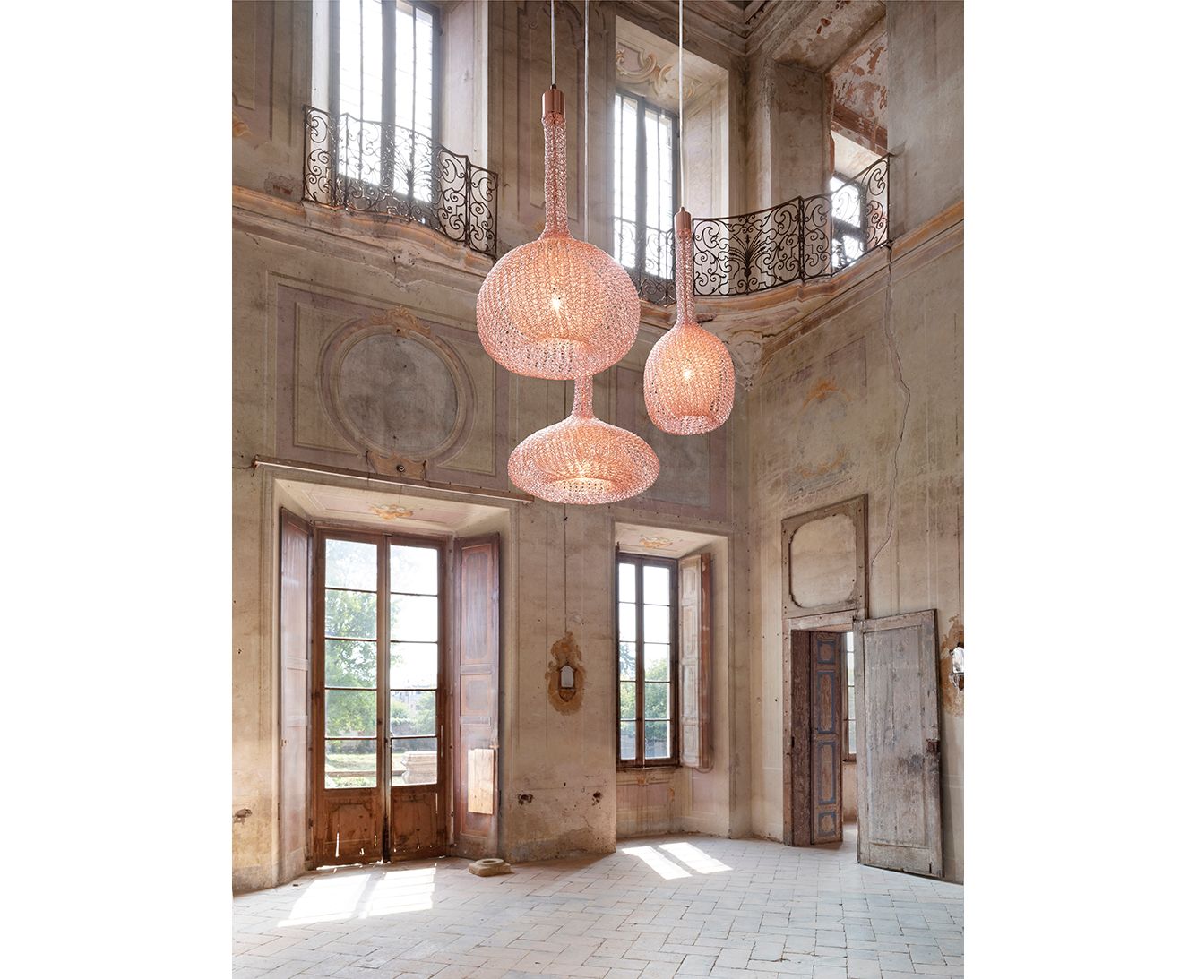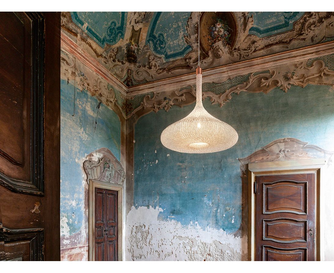 LUCE получила свое название от захватывающего чувственного явления, почти духовного по своей природе, которое связывает человека с окружающей средой. Эта лампа создана путем плетения проводящей нити голыми руками, что позволяет передать идею непосредственно в форму, что является неразрывным синтезом структуры и декора. Линии тени, генерируемые светом LUCE, рассеиваются по поверхностям и объектам, связывая их друг с другом таким образом, что они могут свободно плавать в освещенной среде по-новому, как вызывающе, так и захватывающе.