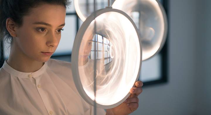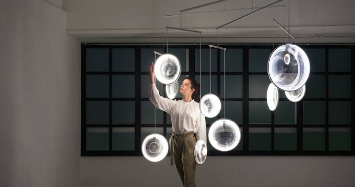 Focus от Yuji Okitsu создает новый пейзаж, реагирующий на тонкие изменения окружающей среды в пространстве, фокусируя и перестраивая существующие элементы, такие как свет и воздух. Ряд плоских и легких линз подвешены к потолку. Они улавливают, собирают и рассеивают естественный свет из окон и окружающего света во внутреннем пространстве во всех направлениях и углах. При этом они обрамляют окружающие пейзажи во всех направлениях, создавая множество плавающих миров, встроенных в круги света. Тонко балансируя против гравитации, светильник раскачивается и плавно вращается в ответ на окружающий воздушный поток и преобразуется в несколько конфигураций.
