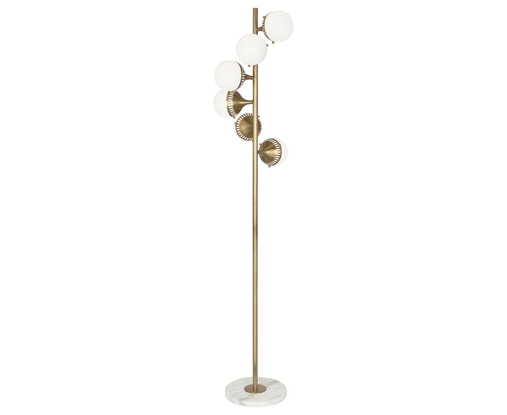 Современная напольная лампа Rio с подсветкой из стеклянного шара середины столетия. Она оснащена шестью лампами, каждая из которых украшена декоративным вырезанным мотивом, а также спиральным верхом ствола на толстой мраморной основе. Выберите один из трех вариантов отделки: глубокая патина-бронза для промышленного шика, полированный никель для яркого модернизма или антикварная латунь для винтажного тепла.