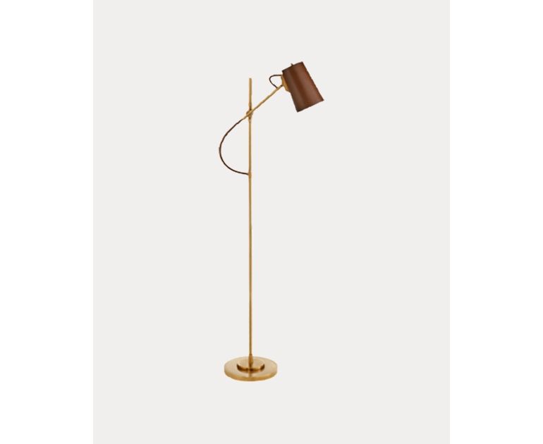 Обтекаемый силуэт торшера Benton, изготовленный из цельной латуни, дополнен мягким кожаным плафоном и кожаным шнуром. Регулируемая форма позволяет точно настроить как высоту, так и ширину.