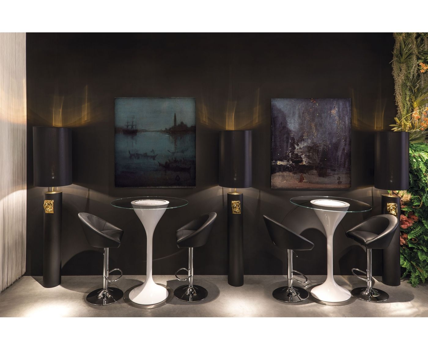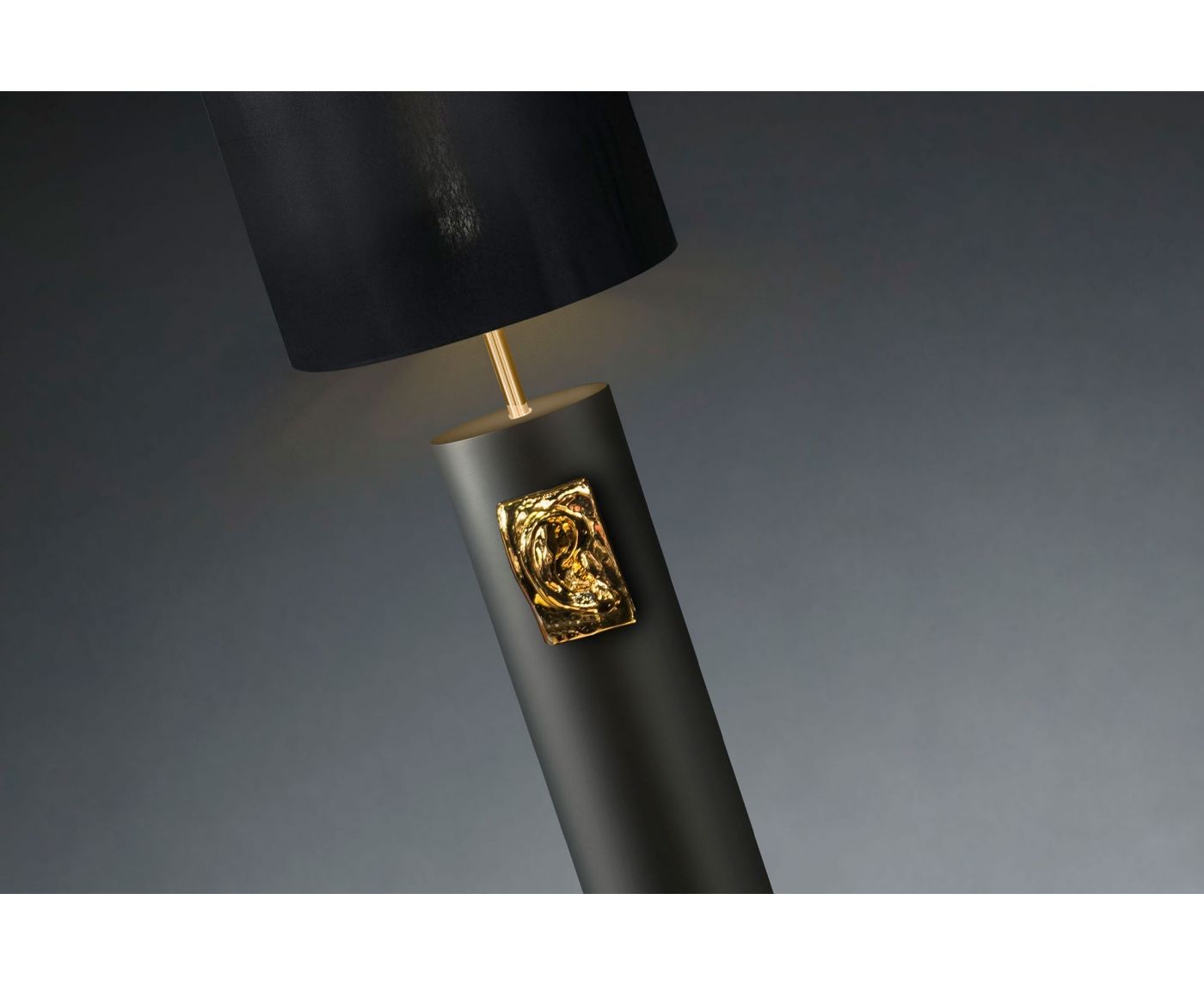 Торшер из керамики ручной работы, отличающийся современным дизайном и в тоже время вдохновленный классическими скульптурами итальянского искусства. Основа в матово-черном цвете с 24-каратным золотым элементом, абажур черного цвета, золотистая отделка внутри.