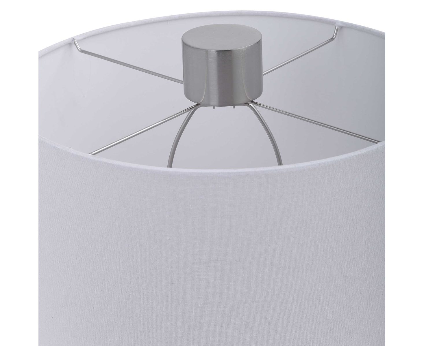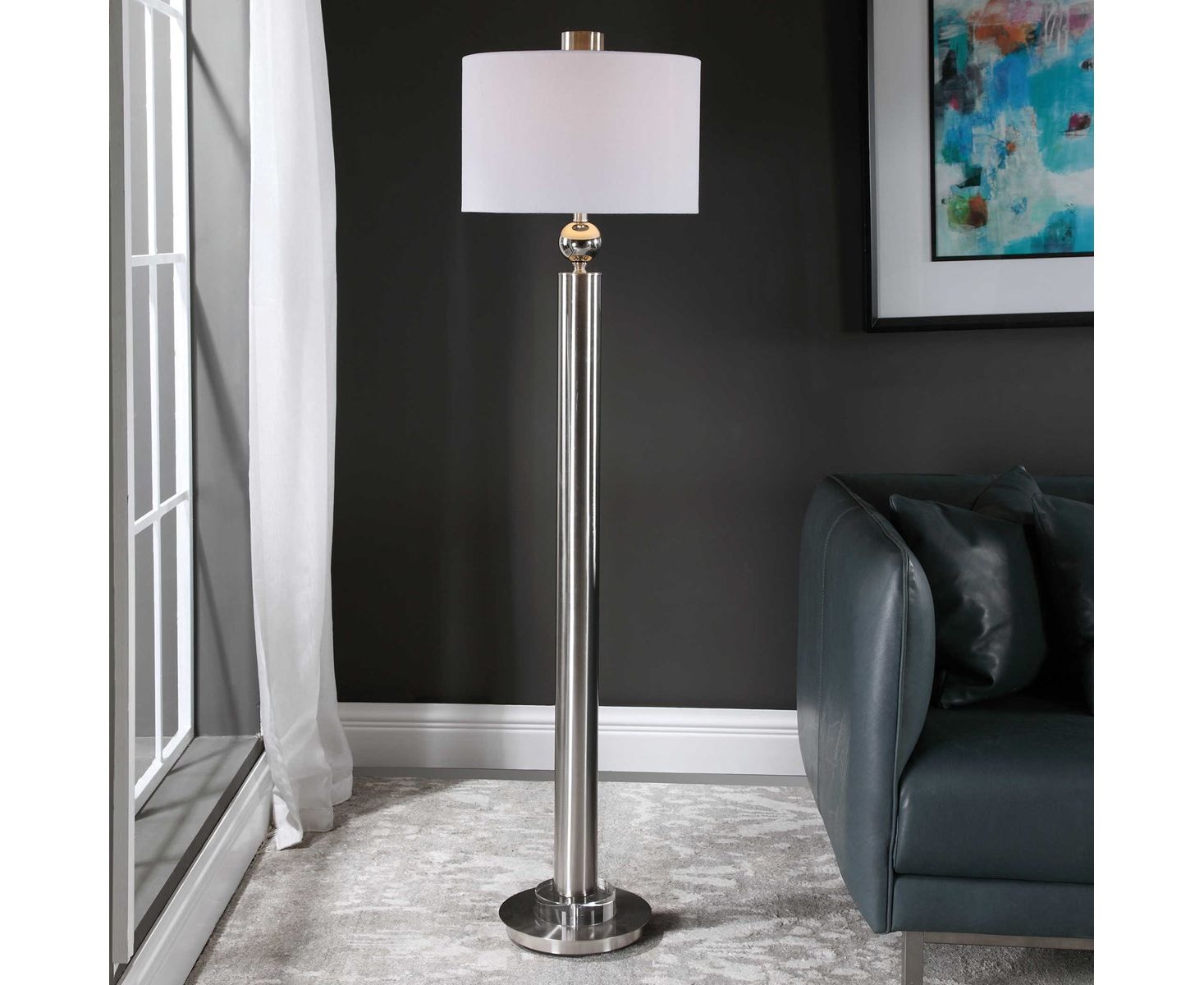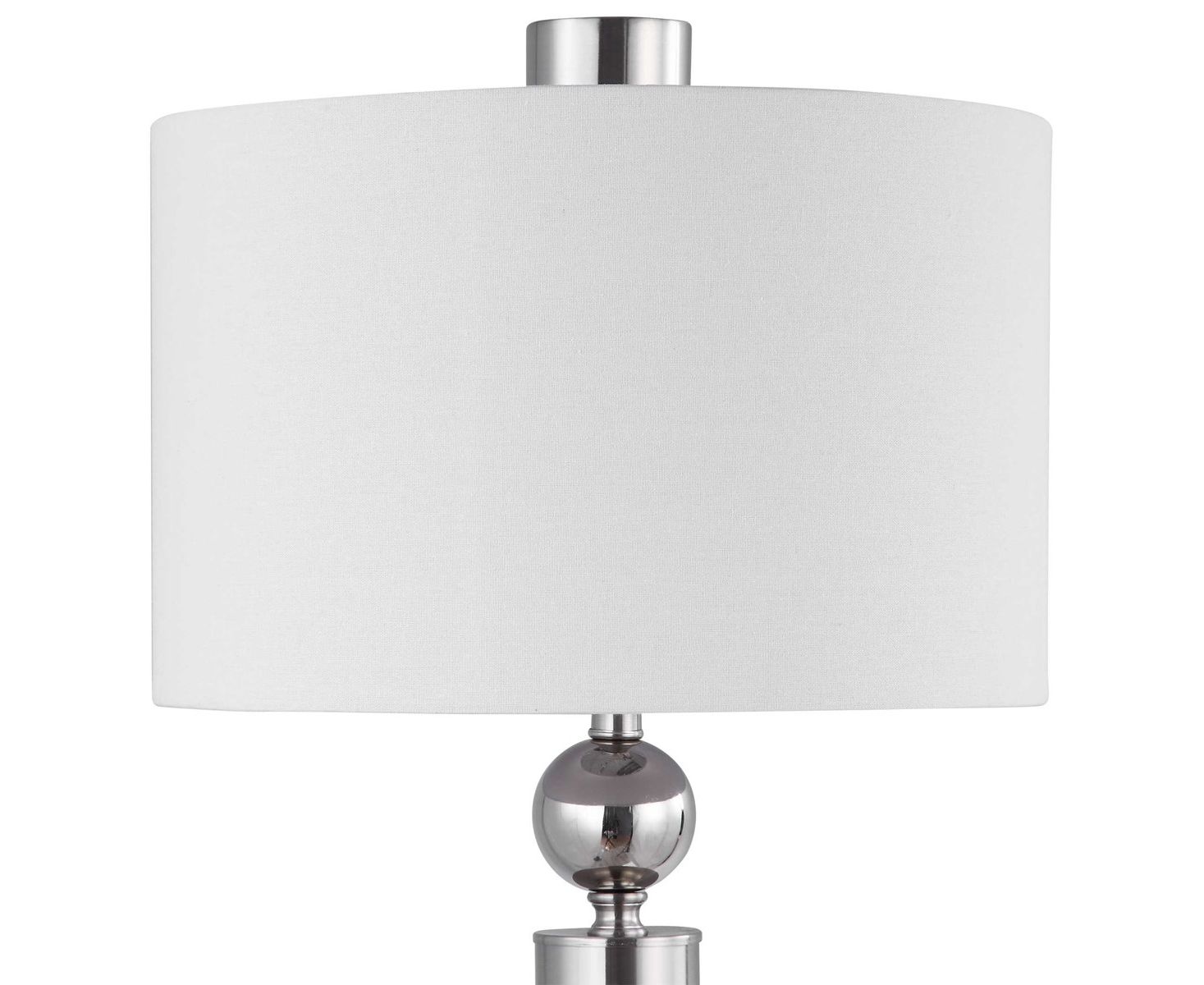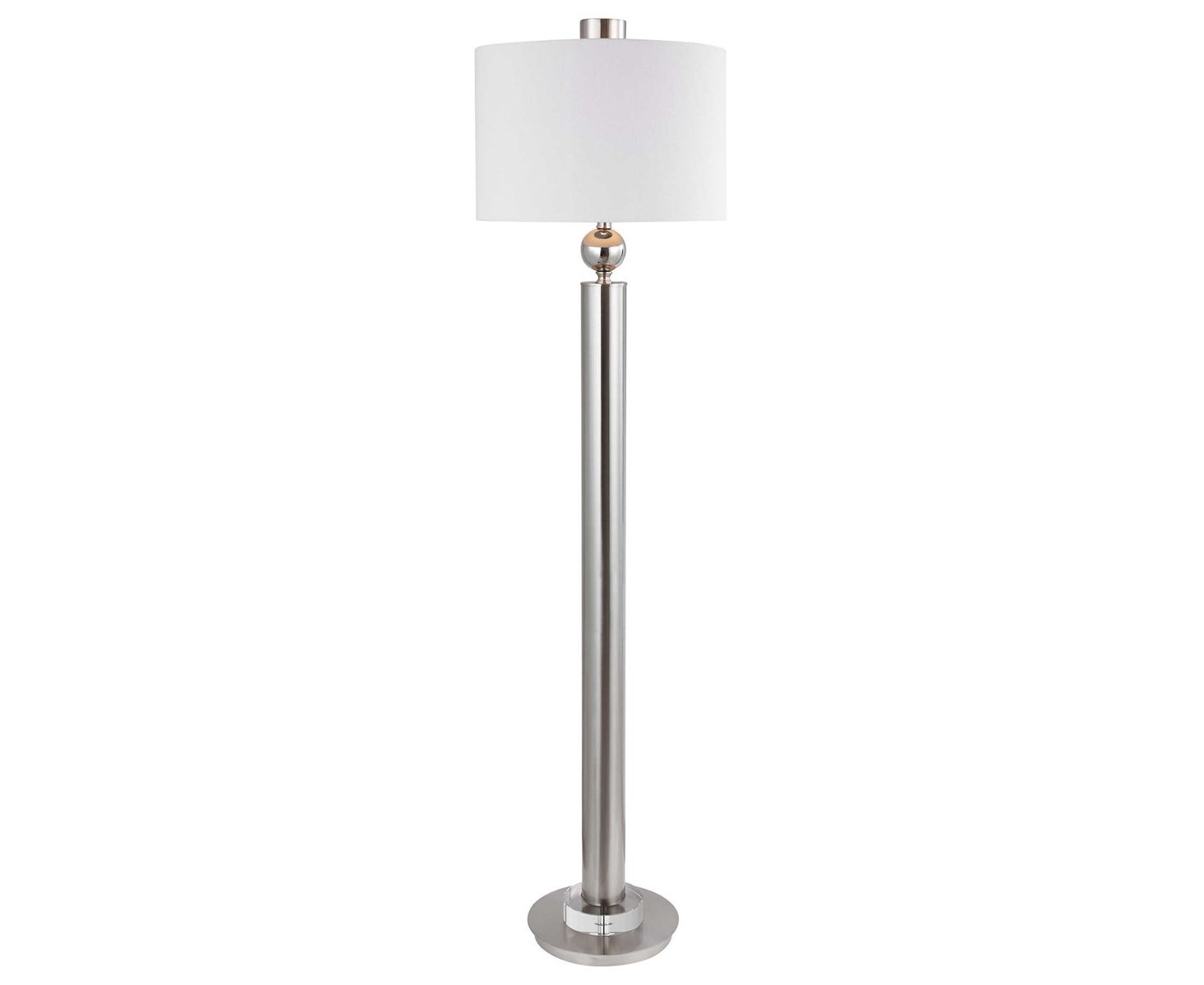 Этот обновленный современный торшер имеет матовое никелированное основание с орнаментом из полированного никелевого шара, украшенным элегантными деталями из хрусталя. Нижняя часть соединена с абажуром в форме барабана из белой льняной ткани.