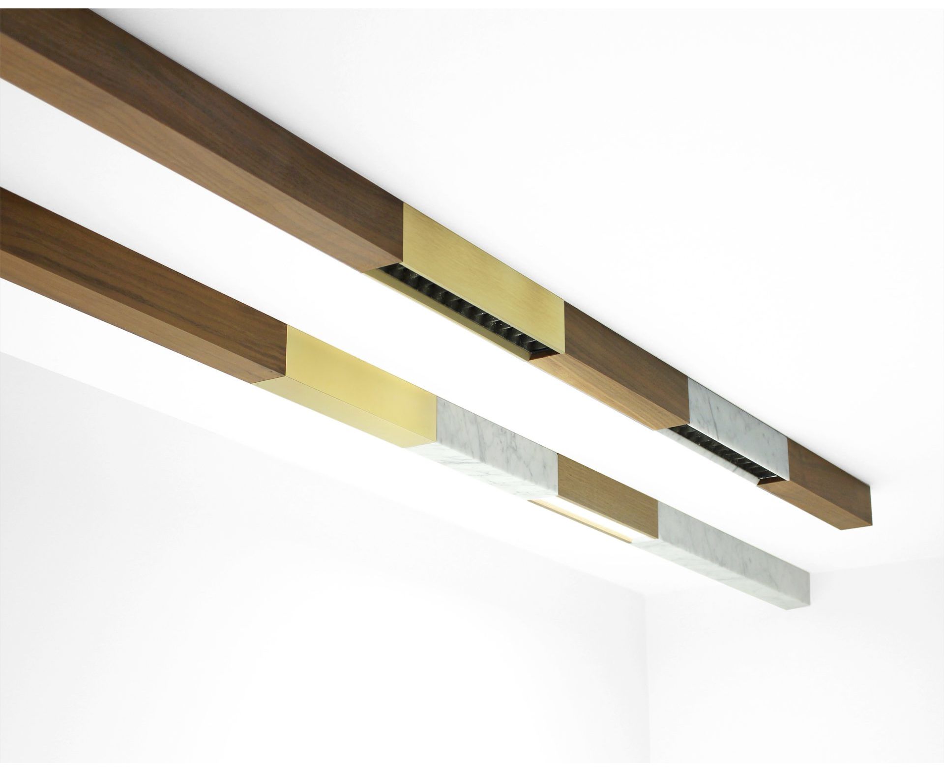 "Мы заметили, что в индустрии освещения преобладают черный и белый цвета, особенно для линейного освещения. Это вдохновило нас на создание альтернативы. Мы не хотели ограничиваться использованием только одного отдельного материала, мы хотели раздвинуть границы и изучить использование различных материалов. У нас был стильный дизайн, простой в установке, модульный и без видимых элементов крепления. Чтобы можно было передавать электричество различным осветительным приборам, была выбрана стандартный трек. Bloc прикрепляются к нему с помощью зажимов и / или адаптеров. Самой сложной задачей было согласование различных материалов, каждый из которых имеет свои уникальные характеристики. Для нас было важно работать с аутентичными, качественными материалами - без подделок и с местным источником. Кажущаяся простой форма скрывает сложность и утонченность.