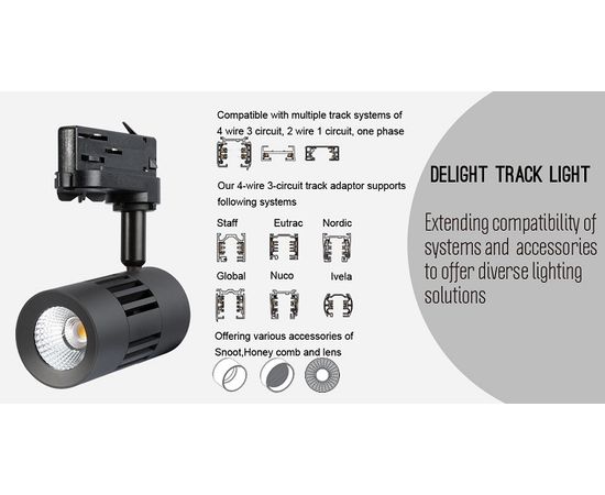 Представленные системами из 4-х проводных, 3-х цепей, двухпроводных, одноконтурных, а также однофазных шинопроводов, восхитительный современный свет для магазинов может использоваться в различных применениях без специального обслуживания и, экономя энергию. Этот светильник может использоваться вместе с большим количеством аксессуаров, таких как snoot, соты и с разными линзами 10 °, 24 °, 38 ° и 60 °.