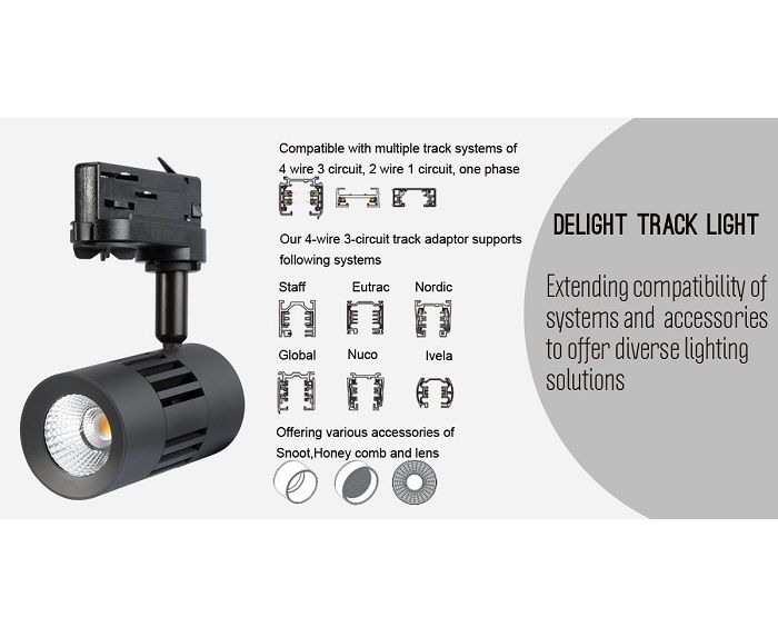 Современное освещение треков Delight обеспечивает гибкое решение для регулировки положения света с углом поворота на 350° и наклоном на 90° для создания удивительного акцента и решения различныех задач освещения. Этот современный светодиодный трек обеспечивает высокую мощность освещения с эффективностью светового потока до 90 lm/W, подходящей для установки на высокие потолки. Кроме того, он создает сверкающие и удивительные световые эффекты с отличным качеством цвета, что гарантируется выдающимся дизайном оптики, а также улучшенным цветовым индексом более 90 CRI.