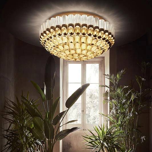 Odeon отдает дань уважения театру концентрическими коронками из комбинированного металлического золотого флекса и лентифлекса, стеклоподобного волнистого технополимера. Он доступен в двух размерах, диаметром 65 или 100 см, и поставляется полностью собранным.