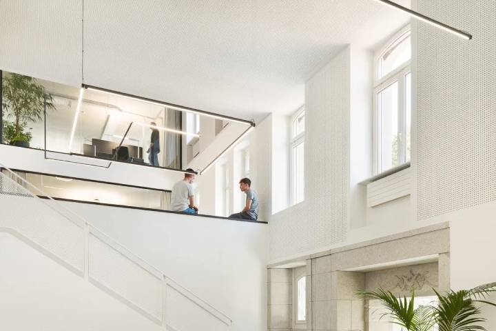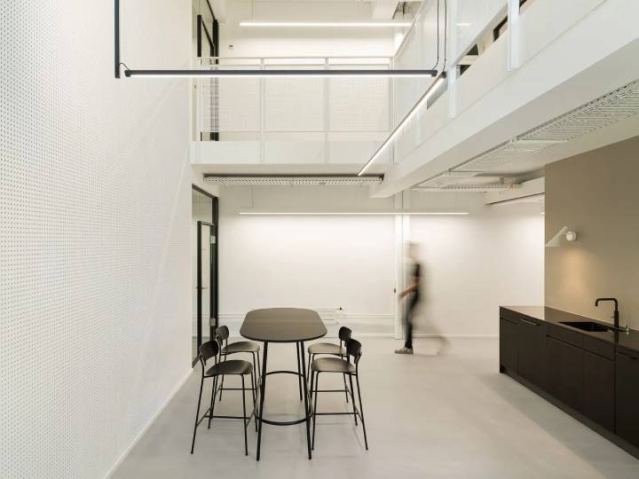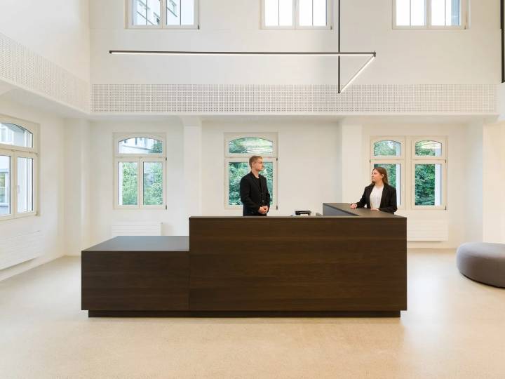 Архитектурная фирма Dost Architektur GmbH из Шаффхаузена завершила проект, обновив его интерьер с помощью плавных пространств, которые облегчают взаимодействие и командную работу. Просторные открытые помещения обставлены современной минималистской мебелью в приглушенной палитре белого, черного и коричневого цветов, в то время как стеклянные двери и высокие потолки усиливают ощущение текучести между офисами и этажами.
