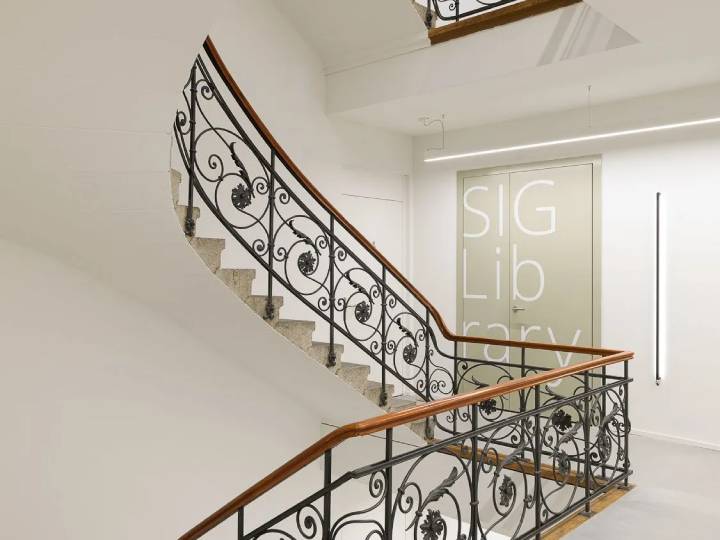 У двери в библиотеку Sig на страже стоит одинокий стержневой жезл. Стройная и элегантная, простая вертикальная линия подчеркивает изысканный стиль входа, его черная отделка перекликается с цветом богато украшенной лестницы. На лестничных площадках дизайнеры расположили светильники в виде открытого параллелограмма, чтобы отметить место и стимулировать общественные собрания.