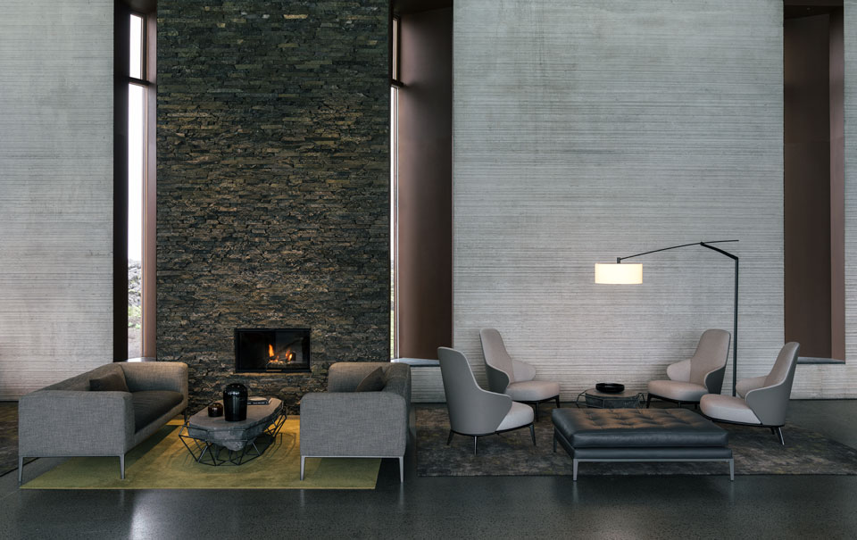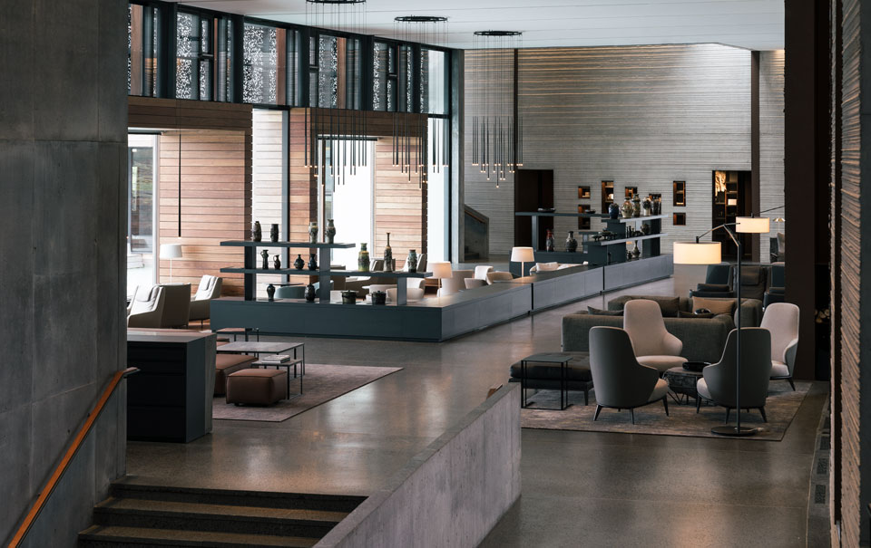 Световое оформление продуманно и минимально, чтобы не отвлекать внимание от уникального окружения, а светильники Vibia можно найти в общественных местах. Slim от дизайнера Jordi Vilardell служит изящным акцентом в лобби под открытым небом, его длинные элегантные конусы подвешены над неровной каменной стойкой. Обтекаемый профиль Slim играет в противовес грубому материалу, а диффузоры из штампованного стекла омывают поверхность мягким светом.