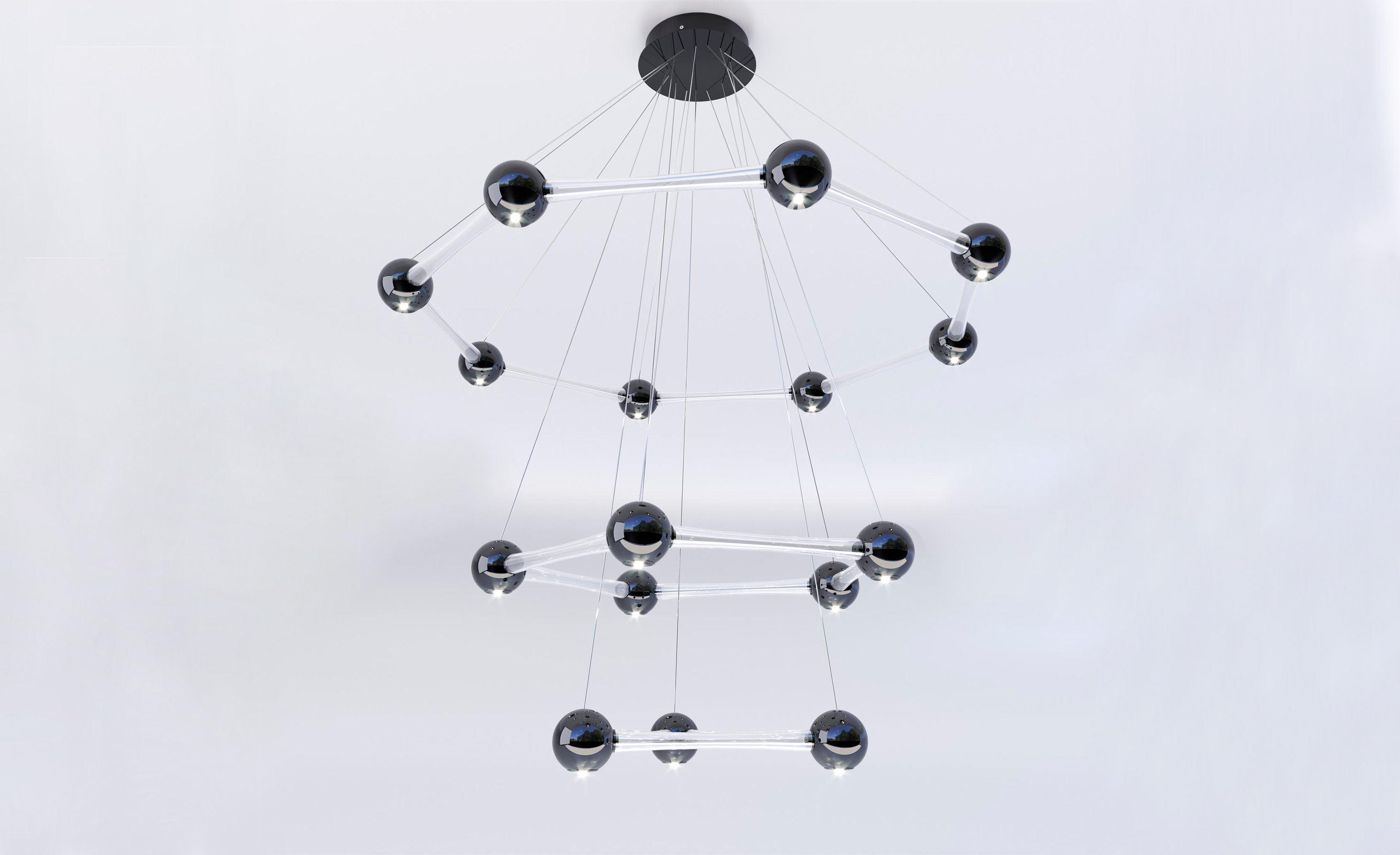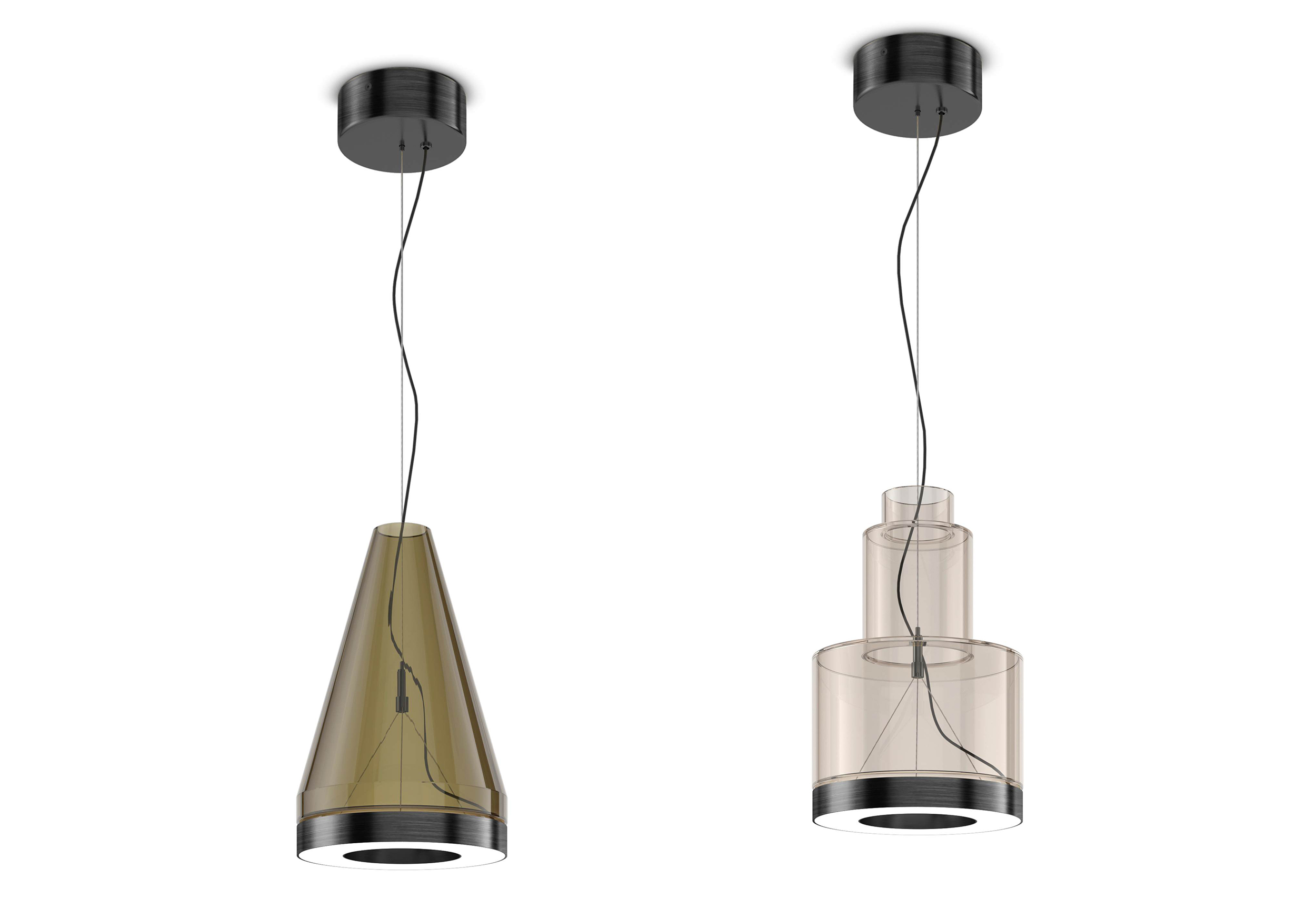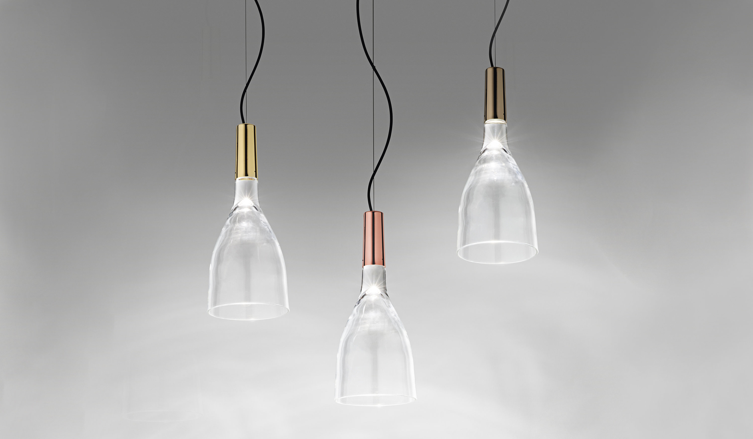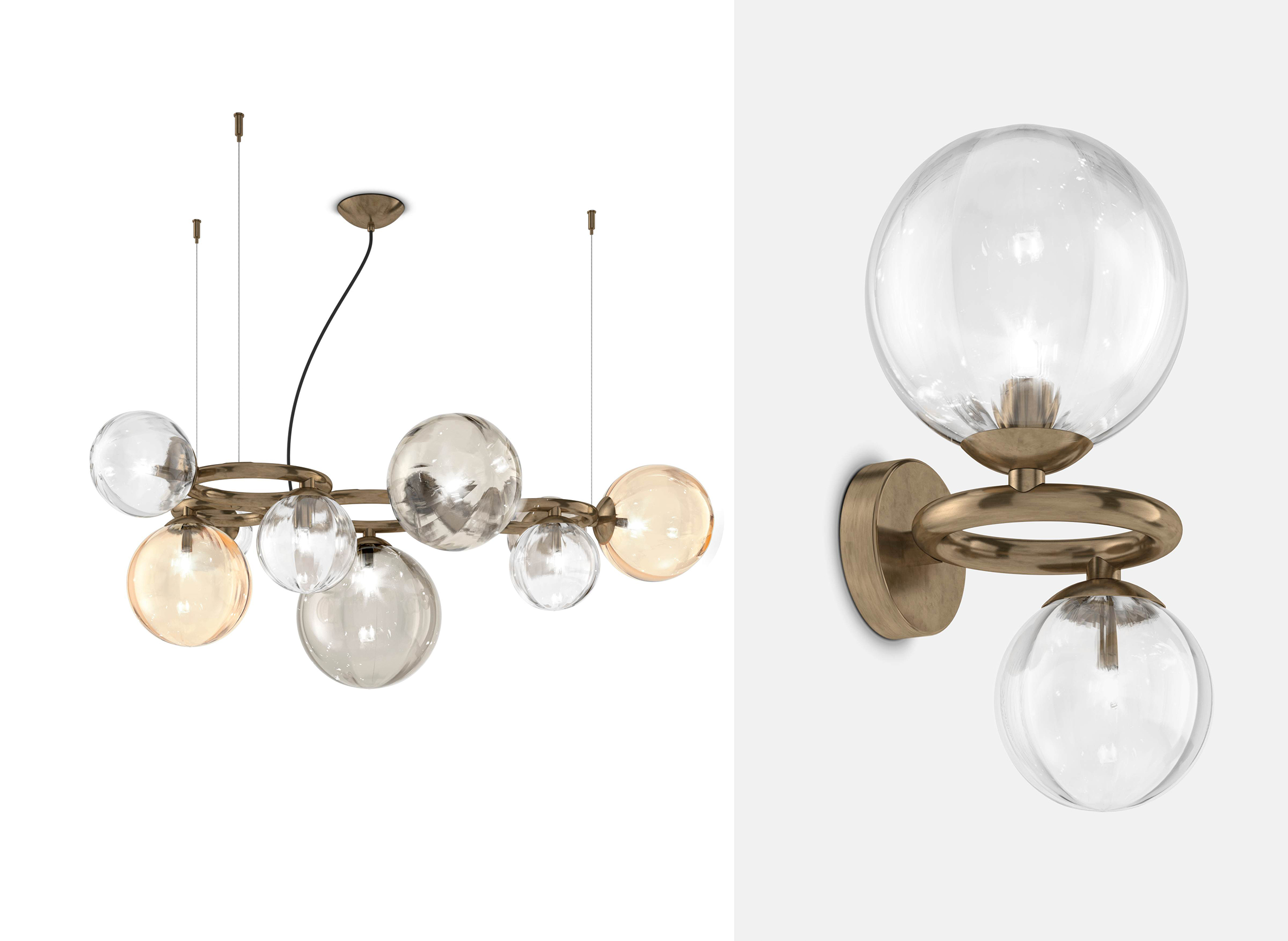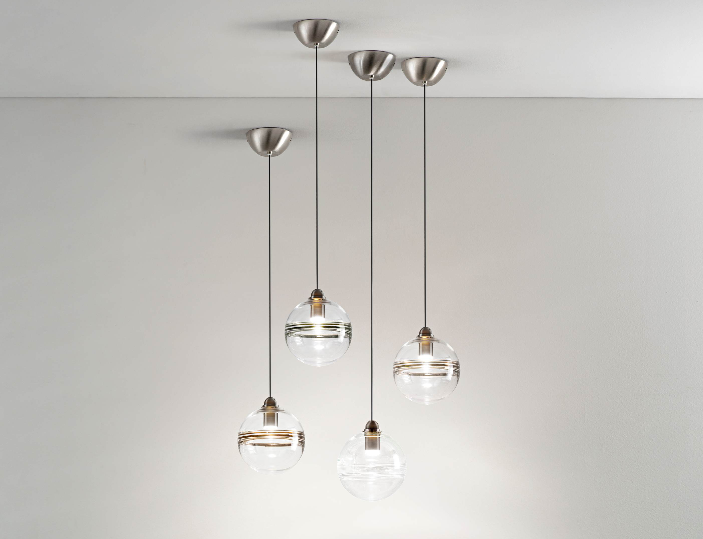 Игры металлических окружностей вокруг стеклянных цилиндров, как будто для создания бесконечных колец. Коллекция с современными коннотациями и светодиодным источником, содержащая ценные исторические особенности обработки стекла, такие как баллоттон, прямой и витой ригадин, все изящно украшенные теплыми тонами прозрачного, дымчатого, янтарного и светлого аметиста.