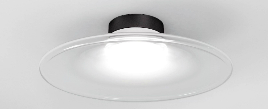 Стекло и светлая гамма цветов создают переходные полутона, подчеркивая их форму, как в акварели ярких прозрачных пленок. Светодиодный источник освещает поверхность и стекло одновременно, привнося к потолку часть мягкого цветного света.
