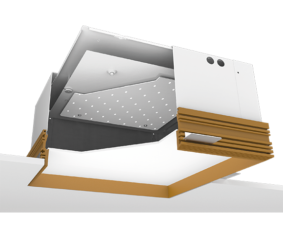 В версии Korona диффузор перемещается вверх, что позволяет видеть внутреннюю раму. Эта рама может поставляться в одном из 25 + 5 цветов PROLICHT и устанавливать стильные акценты: светильник PI2 без отделки действует как цветной стержень, открывающий потолок для дневного света.